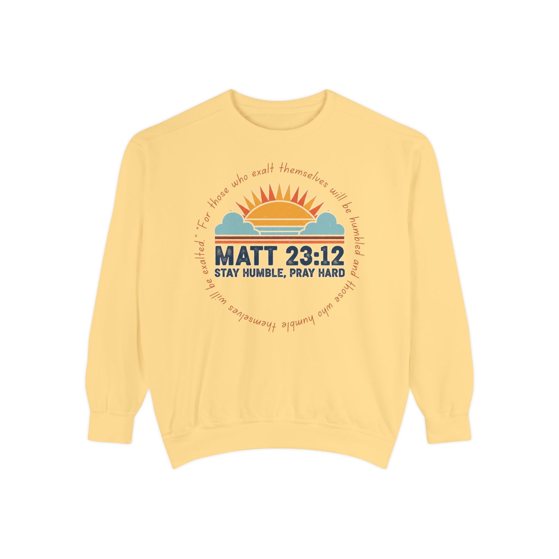Stay grounded in style with this ultra-soft Comfort Colors® sweatshirt featuring a sunrise-inspired graphic and Matthew 23:12 scripture. The design reads “Stay Humble, Pray Hard” with a radiant sun and cloud motif, surrounded by the verse: “For those who exalt themselves will be humbled and those who humble themselves will be exalted.”