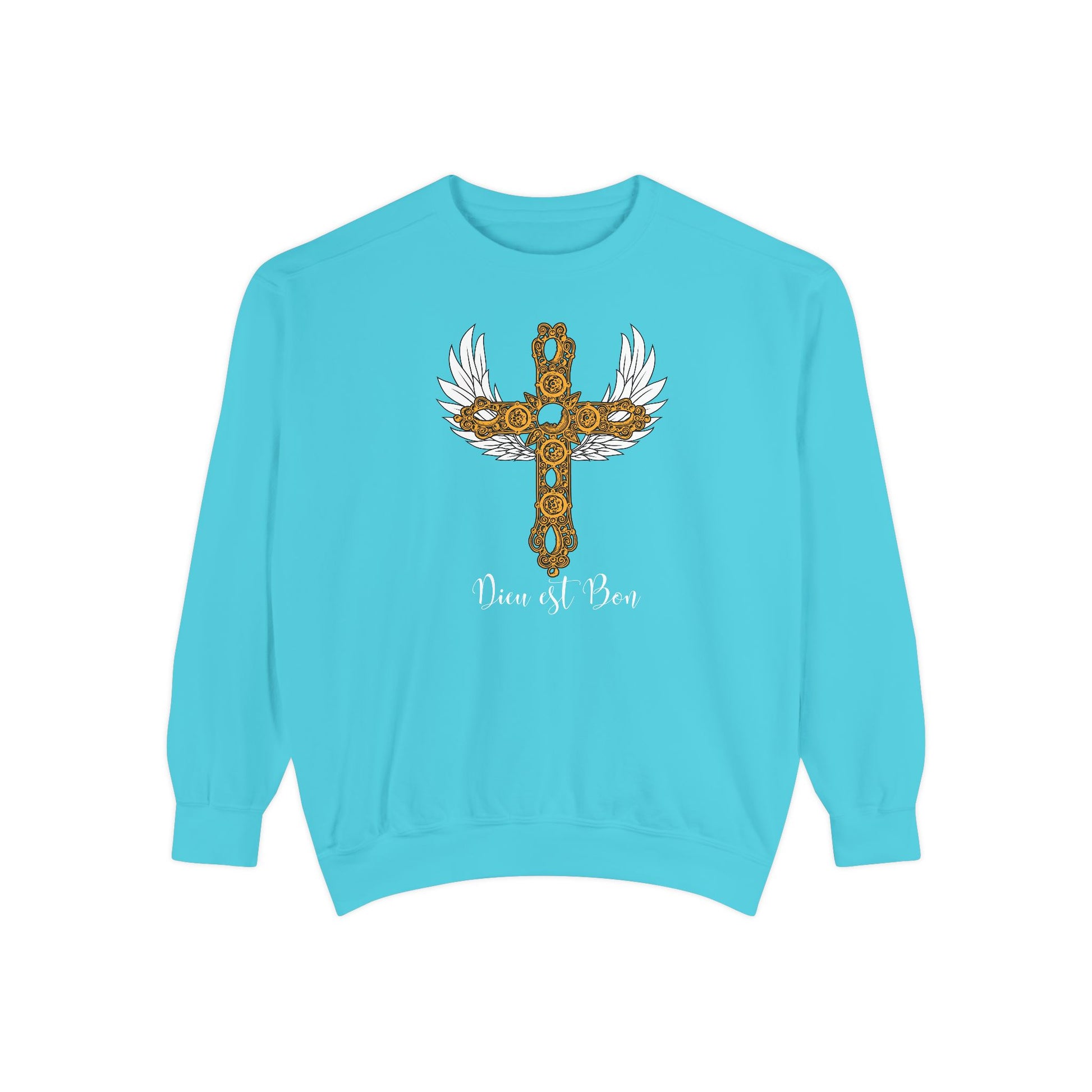 Luxurious comfort and style are what this unisex, garment-dyed sweatshirt is all about. It's made with 80% ring-spun cotton and 20% polyester and the fabric is 3-end garment-dyed, ring-spun, color-blast fleece with a 100% cotton face. Each Wrap yourself in comfort and calm with this beautifully styled “Dieu est Bon” (God is Good) sweatshirt. Printed on the premium Comfort Colors® 1566 crewneck, it offers a relaxed fit, garment-dyed softness, and a lived-in feel from day one.