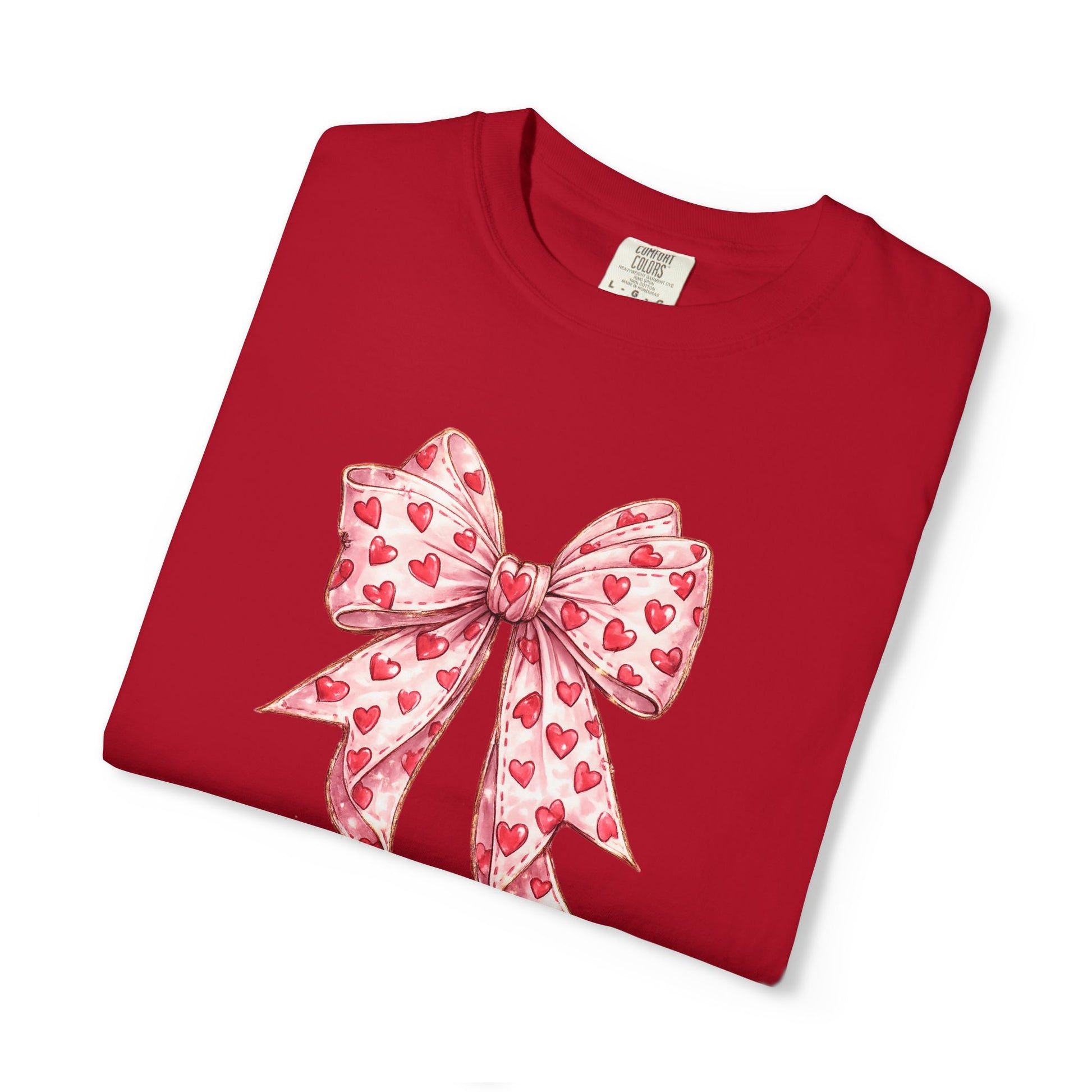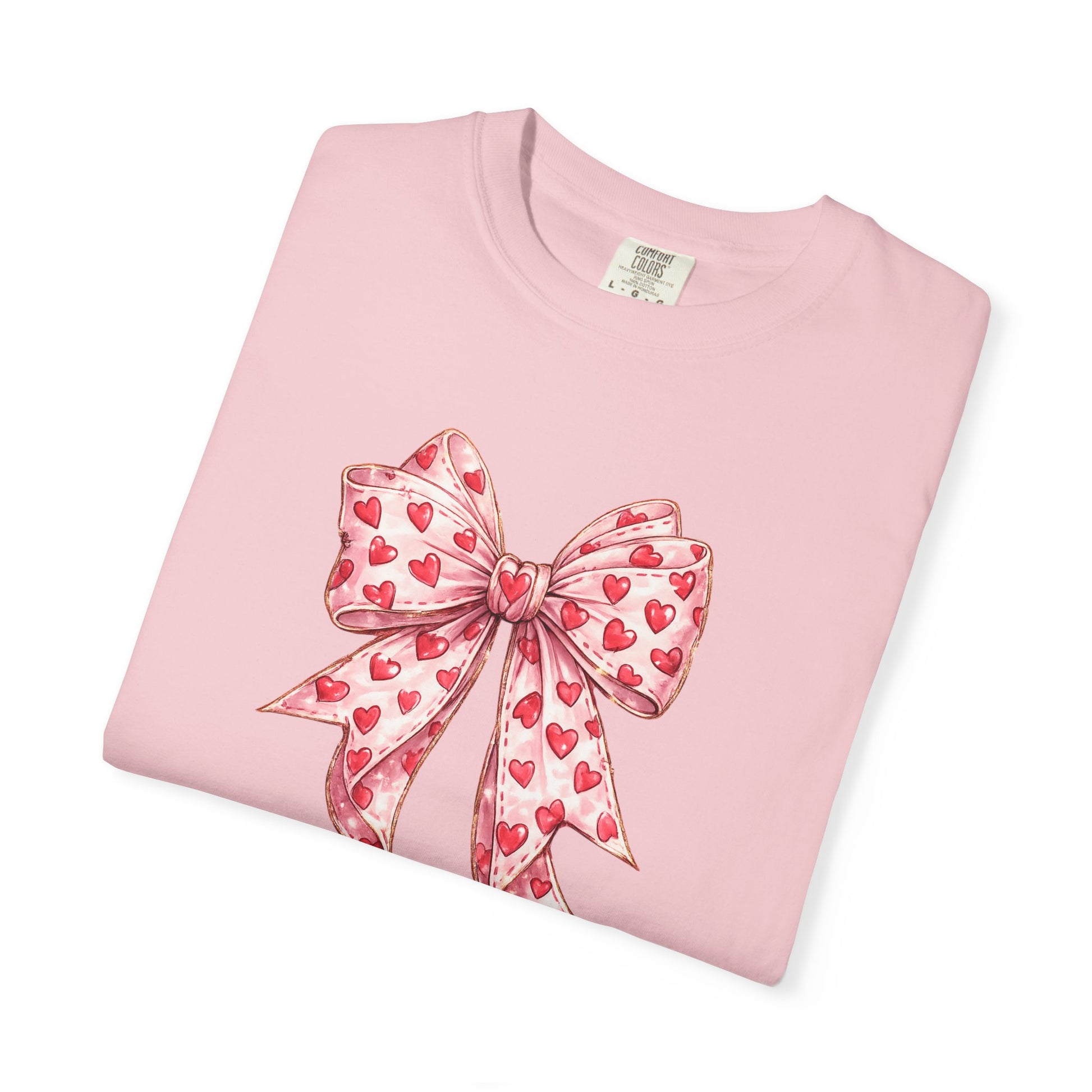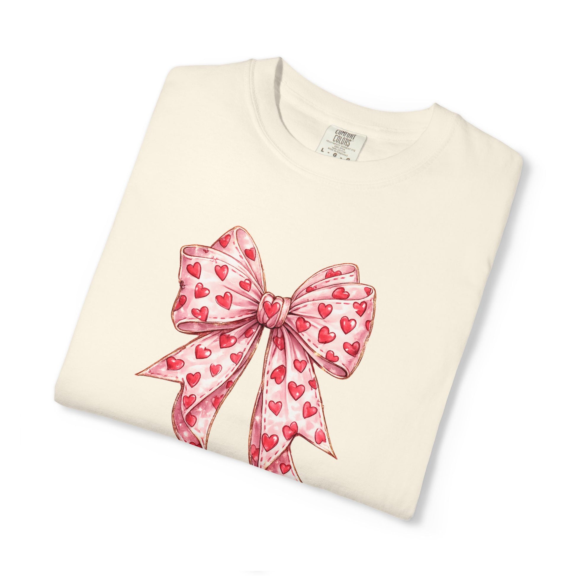 A softly worn, garment-dyed tee that feels like an easy afternoon hug. Lightweight but substantial, the relaxed silhouette carries a hand-drawn ribbon illustration dotted with tiny hearts — playful, gentle, and quietly romantic. This shirt sits right with someone who layers cozy pieces, collects meaningful prints, or loves subtle, handcrafted-looking details. Wear it on slow mornings, casual date strolls, or while wrapping gifts and listening to quiet playlists. The fabric breaks in beautifully over time, the color ages with you, and the sewn-in label keeps the neckline clean for everyday wear.